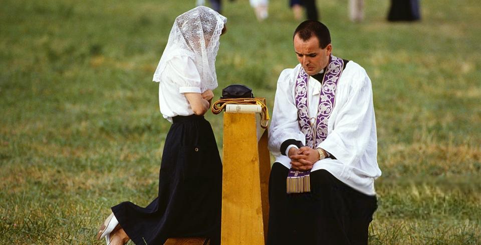 De même dans le sacrement du Pardon, les péchés confessés sont pardonnés lorsque le prêtre lève les mains et prononce la formule d'absolution. Au moment même ou le signe extérieur est donné, la grâce est donnée à l'âme.